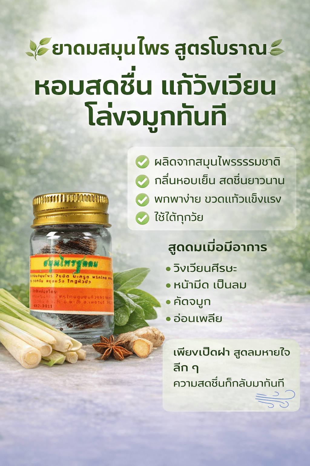 สัมผัสพลังการบำบัดจากสมุนไพรไทยที่คัดสรรมาอย่างดีที่สุด โดยเฉพาะ “ไพลสด” ที่ผ่านการสกัดจนได้น้ำมันเข้มข้น ยาหม่องบ้านห้วยทรายเหนือคือคำตอบของอาการล้าจากการทำงานและชีวิตประจำวัน กลิ่นหอมที่เป็นเอกลักษณ์ช่วยปลอบประโลมทั้งร่างกายและจิตใจให้กลับมาสดชื่นอีกครั้งครับ ✨