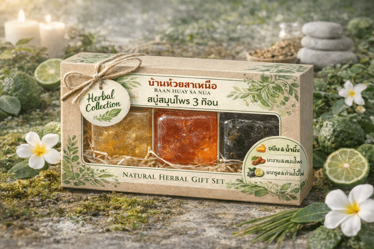 เซตสบู่สมุนไพรสูตรธรรมชาติ ช่วยทำความสะอาดผิวอย่างอ่อนโยน ลดความมัน และบำรุงผิวให้เนียนนุ่ม ผลิตโดยชุมชนหมู่บ้านห้วยทรายเหนือ เหมาะสำหรับใช้เป็นประจำทุกวัน
